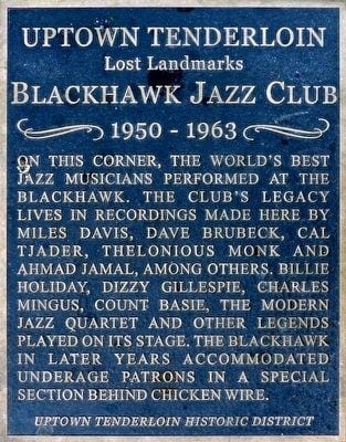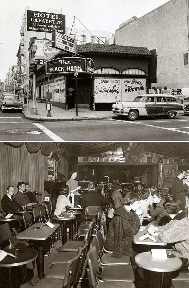 Among the many who appeared at the Black Hawk (Turk & Hyde Streets in the uptown Tenderloin) were Chet Baker, Count Basie, Art Blakey, Earl Bostic, Dave Brubeck, John Coltrane, Miles Davis, Art Farmer, Russ Freeman, Stan Getz, Vince Guaraldi, John Handy, Billie Holiday, Louis Jordan, John Lewis & the Modern Jazz Quartet, Shelly Manne, Johnny Mathis (“discovered” at the Black Hawk), Charles Mingus, Thelonious Monk, Gerry Mulligan, Charlie Parker, Horace Parlan, Art Pepper, Oscar Peterson, Andre Previn, Mongo Santamaría, George Shearing, Art Tatum, Cal Tjader, and Lester Young.