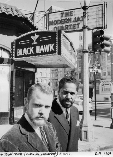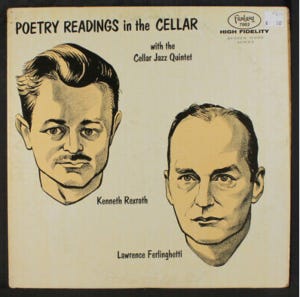 Dave Brubeck debuted at the Black Hawk in 1950, and his bandmates, particularly saxophonist Paul Desmond, fell in with Rexroth’s loose circle of bohemians, anarchists, libertarians, and political progressives. Along with The Cellar (Green Street & Columbus Avenue, not far from Lawrence Ferlinghetti’s City Lights Books), the Black Hawk offered live jazz, sometimes backing Rexroth, Ferlinghetti, and other versifiers.